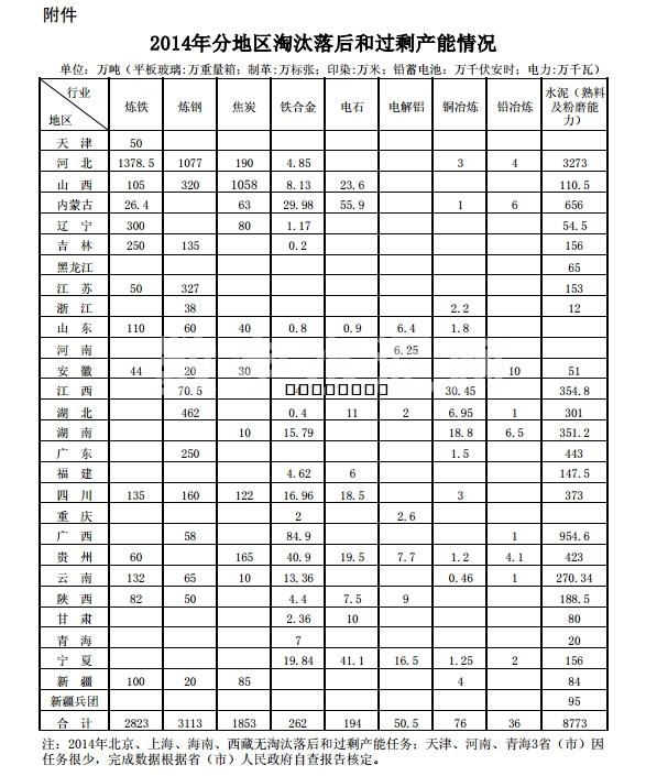 工信部表示,经考核,电力、煤炭、炼铁、炼钢等18个行业均完成了2014年淘汰落后和过剩产能目标任务。全国共淘汰电力产能486万千瓦、煤炭2.3亿吨、炼铁2823万吨、炼钢3113万吨、焦炭1853万吨、铁合金262万吨、电石194万吨、电解铝51万吨、铜冶炼76万吨、铅冶炼36万吨、水泥(熟料及粉磨能力)8773万吨、平板玻璃3760万重量箱、造纸547万吨、制革622万标张、印染20.9亿米、化纤11万吨、铅蓄电池(极板及组装)3020万千伏安时、稀土11.4万吨(见附件)。