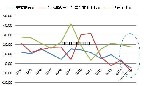 房地产端水泥需求下滑 今年前十个月,基建投资增速同比增长17.39%,虽有一定的下滑但是幅度不算很大,而农村房屋每年的竣工、施工面积近年来一直较为稳定,在11亿平方米以上,波动不大,因而今年水泥需求的萎缩主要是因房地产端水泥需求的下滑而导致的。从投资来看,1-10月份,与水泥需求直接相关的房地产建筑工程投资仅同比增长0.4%,较去年同期增速大幅下滑了10.8个百分点;从施工情况看,住宅项目施工基准周期一般在1~1.5年左右(《房地产项目开发周期基准》),商业办公类年限在2~3年不等,假设新开工项目施工周期1.5年(18个月)、施工速度保持平稳的情况下,今年1-10月开工的项目(18个月内)实际累计完成的施工面积同比大幅下滑8.11%。近十年来,这一指标出现下滑的次数仅有两次,另一次是在2013年,然而2013年由于基建投资增速由2012年的15.27%直接上升到21.32%抵消了房地产需求下滑的影响,全年水泥需求还是增长的,然而今年基建增速反而是出现一定的下行,因此,房地产端水泥需求的下滑导致了今年水泥需求的萎缩。 图1:水泥需求、房地产实际施工面积及基建投资增速走势