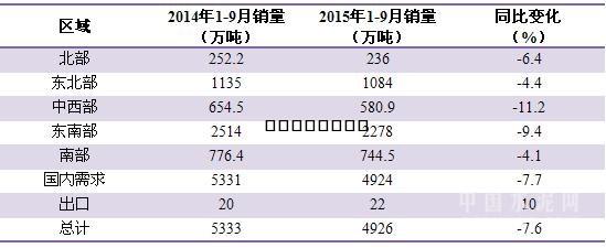 从11月底巴西水泥生产商陆续发布的三季度财报来看,其业绩并不理想。当地建筑市场的低迷,导致水泥销量也大幅下滑。这归咎于房地产融资缩减30%以及基建工程减少20%。 Votorantim 2015年前9个月水泥销量同比下滑4%降至2670万吨。InterCement 水泥及熟料销量亦同比减产7.2%,降至2110万吨。拉法基(256.25元/吨,0%)豪瑞在其大失所望的三季度财报中并未明确指出下滑量。 总体而言,据巴西水泥工业协会(SNIC)称,前三季度全国水泥销量为4920万吨,同比下降7.6%。部分地区跌幅更大,如中西部地区销量跌幅达11.2%,仅为580.9万吨;东南部地区亦有9.4%的降幅,仅2278万吨。东南部地区包括全国最大的水泥生产洲米纳斯吉拉斯州(Minas Gerais),全州拥有水泥年产能2015万吨。 表:巴西国内各区域2014年与2015年前三季度水泥销量对比