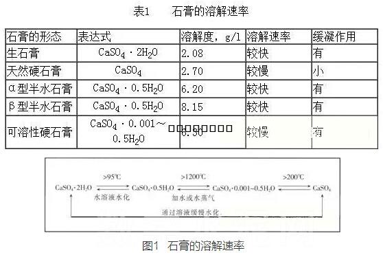 石膏的形态通常有生石膏(CaSO4·2H2O)、天然硬石膏(CaSO4)、半水石膏(CaS O4·0.5H2O)、可溶性硬石膏(CaSO4),其溶解度见表1。由表1可见,天然硬石膏和生石膏的溶解度相近,可溶性硬石膏和半水石膏的溶解度相近。但是,它们的溶解速率有很大的差别,半水石膏溶解速率快,天然硬石膏比生石膏的溶解速率慢得多,可溶性硬石膏是用生石膏或半水石膏有控制地脱水制成的,溶解速率慢。因此它们之间的匹配也影响水泥的流变性能。活性高的C3A溶解快,水泥中早期Ca2+和的水平高,所用的石膏中应有适量溶解速率快的组分;活性低的C3A溶解较慢,水泥中的Ca2+和不应在早期就消耗完,应当在后期还有一定的水平,故所用的石膏中应有适量溶解速率慢的组分(表1、图l)。