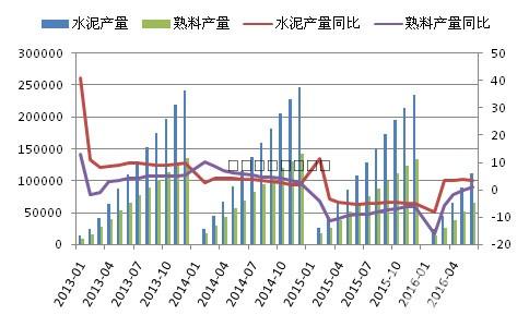 数据来源:国家统计局,中国水泥研究院 从上图可以看出,无论是基建投资的主要行业以及房地产投资房屋施工面积,上半年同比增速均出现了较2015年全年明显提升的走势,全国整体水泥需求量也因此得到明显提升。上半年,全国水泥产量同比增长3.2%,熟料产量同比增长1.24%,去年同期及去年全年水泥及熟料产量均为同比负增长。 图3:全国水泥、熟料产量及累计同比增速(万吨,%)