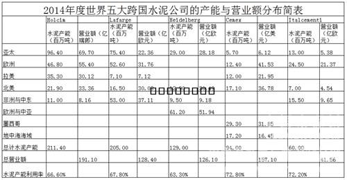 表2 2014年度世界五大水泥跨国水泥公司的产能与营业额分布简表